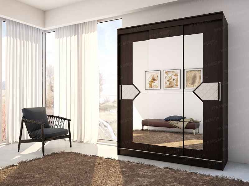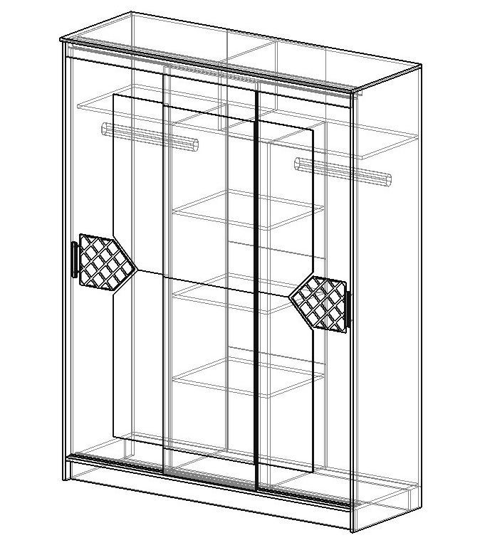 В нем предусмотрено два боковых отделения со штангами для подвешивания одежды на плечиках и одно широкое центральное с полками для хранения текстиля и других домашних вещей.
