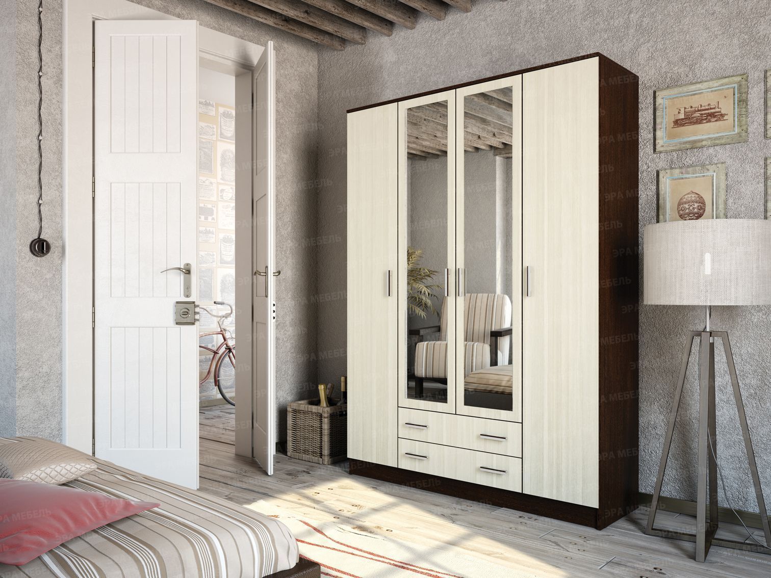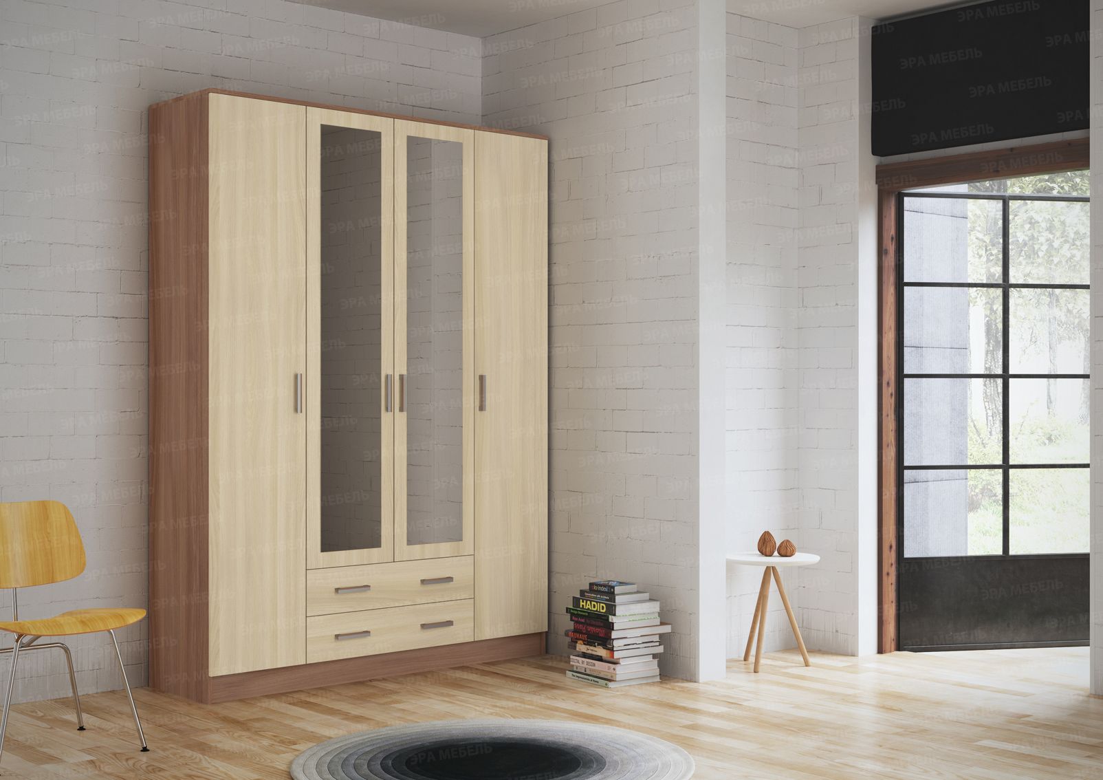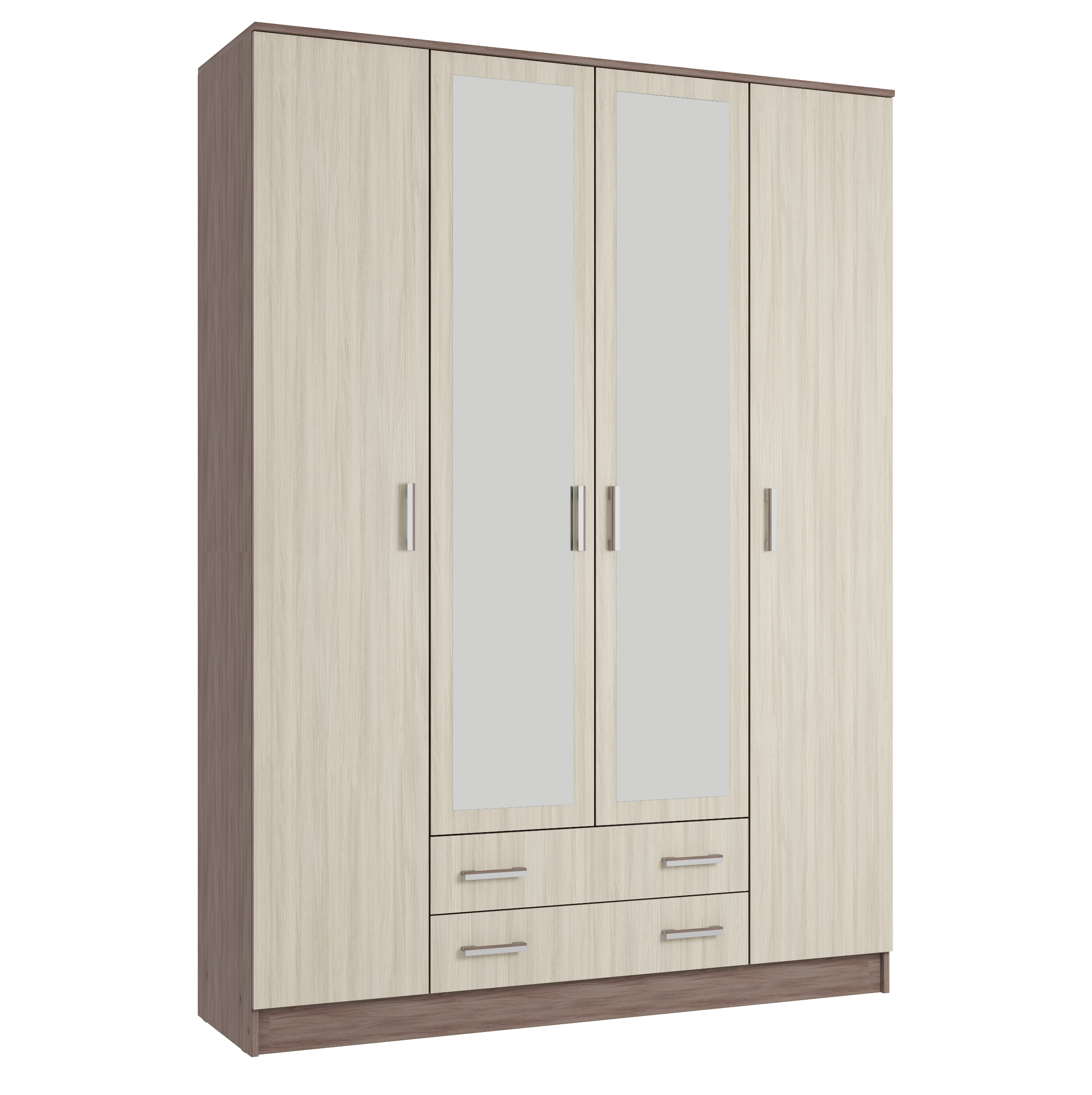 Четырехдверный шкаф "Квадро" - вместительная и эффектная система хранения. В нем предусмотрено два отделения с полками для хранения текстиля и одно широкое центральное с полкой для головных уборов, зонтов и других домашних вещей для подвешивания одежды на плечиках.