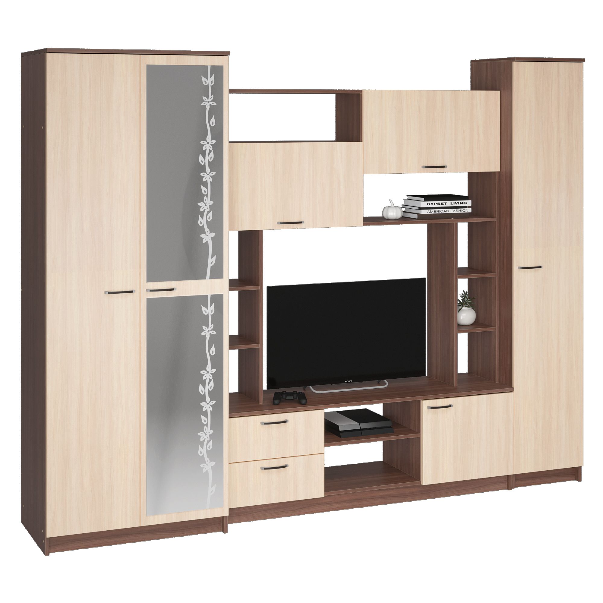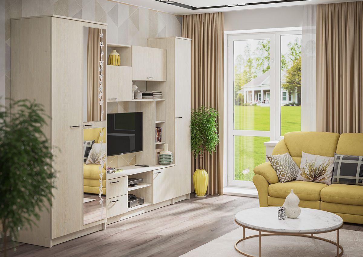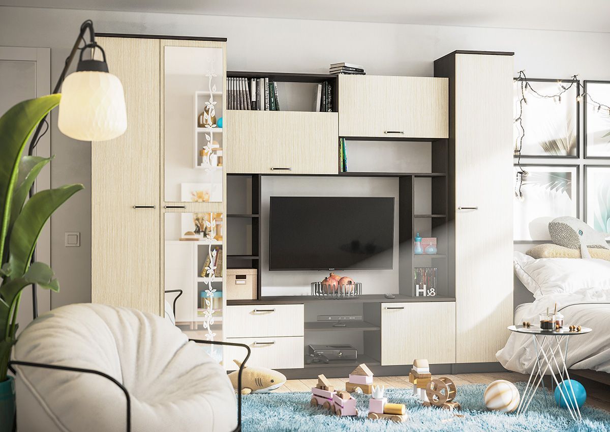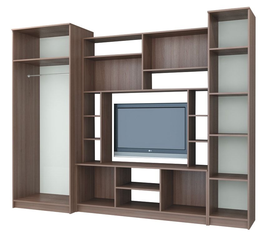 - Гостиная состоит из трёх модулей (шкаф платяной, шкаф бельевой, средняя секция), которые при желании можно устанавливать отдельно друг от друга, размещая в разных комнатах;