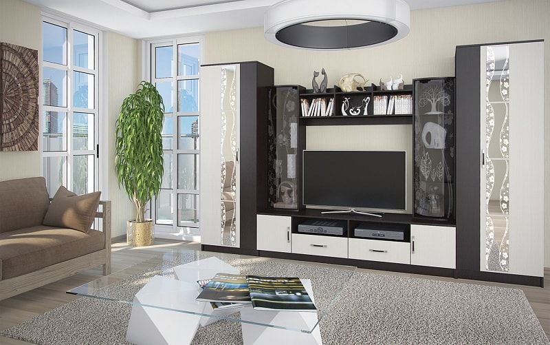 Оснащена вместительной нишей под телевизор, модулями с дверцами из тонированного стекла, подходящим для хранения книг и сувениров.
