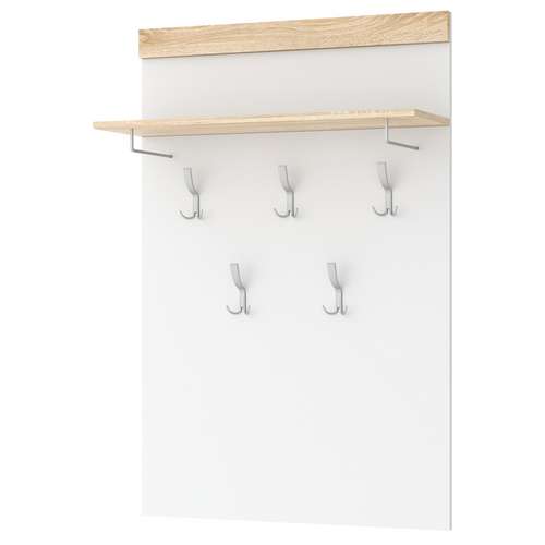 Металлические уголки для опоры полки. Крепится к стене через навесные элементы. Верхняя часть вешалки обрамлёна профилем MDF.