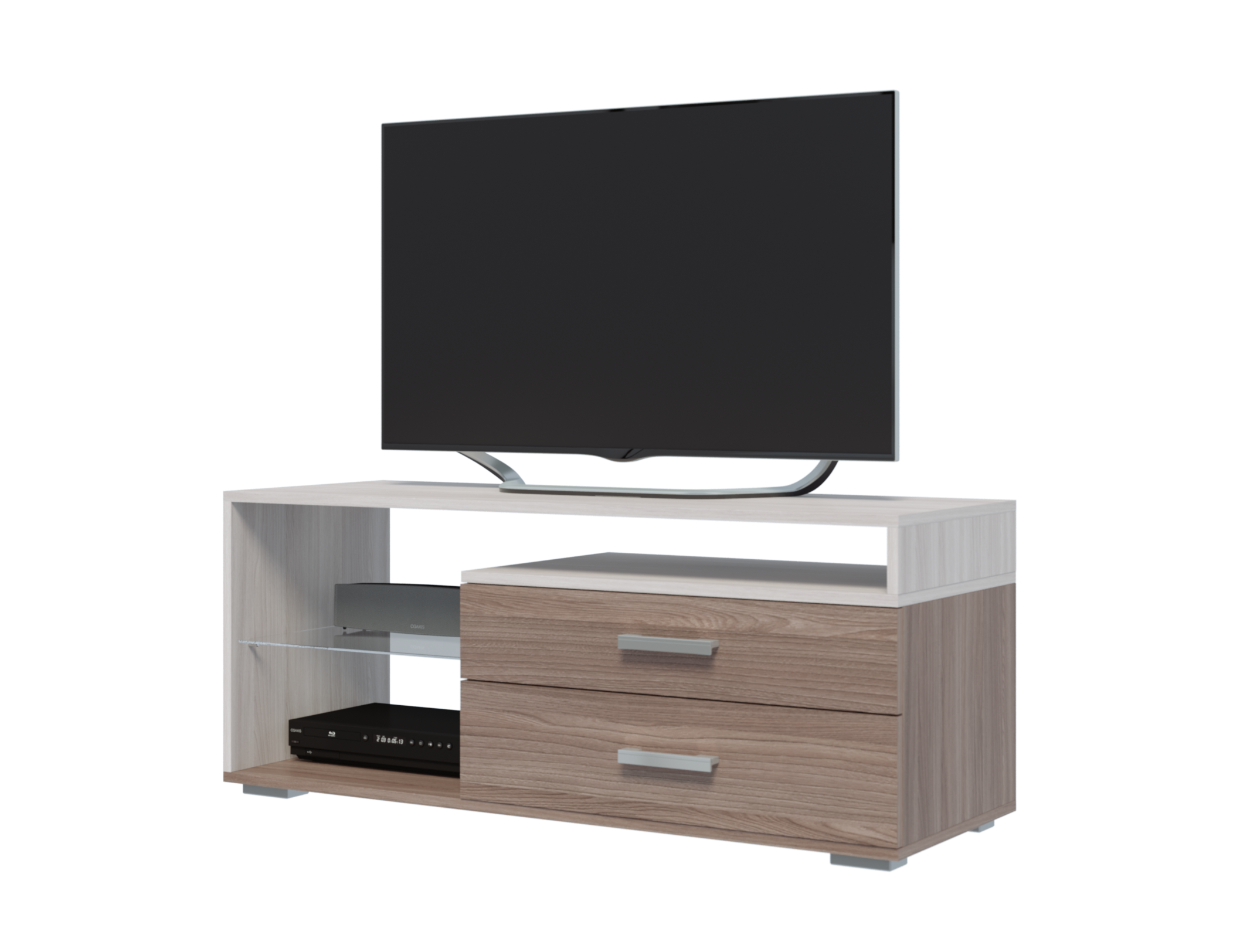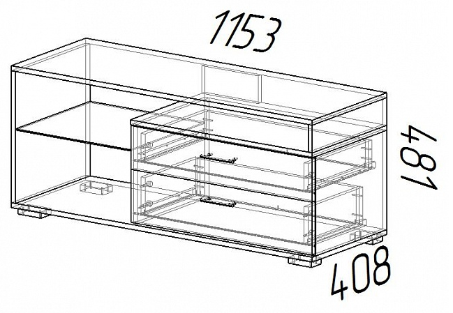 Тумба под ТВ отличается лаконичным дизайном и продуманностью конструкции. Укомплектована двумя выдвижными ящиками и двумя нишами.